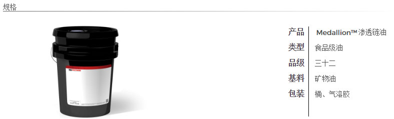 Medallion™滲透鏈條油是一種多用途的輕質(zhì)潤滑油,可用作可能與食用產(chǎn)品接觸的設(shè)備和部件上的潤滑劑,滲透油和防銹膜。 它是H-1和Kosher批準(zhǔn)的NSF注冊(cè)。 獎(jiǎng)?wù)麓┩告溣头浅_m合在-40°F(-40°C)至180°F(80°C)溫度下運(yùn)行的輸送鏈上使用。
