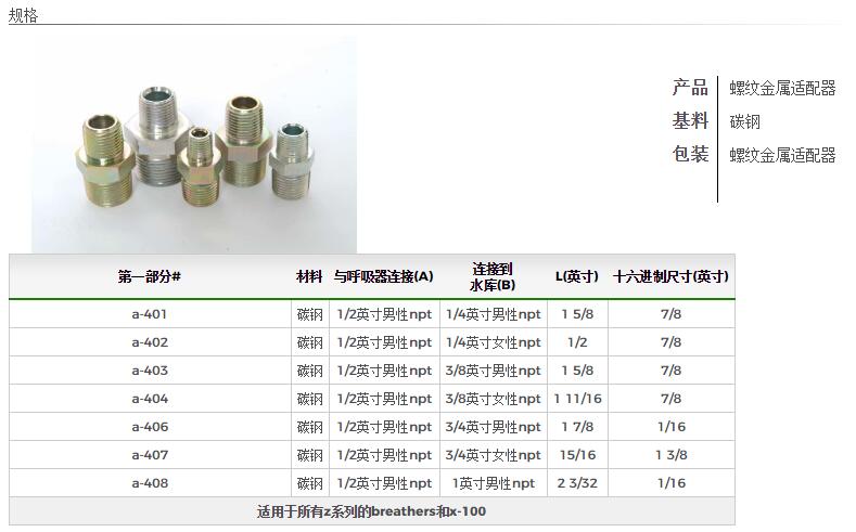螺紋金屬適配器適合x(chóng)系列-x-100呼吸器和任何z系列的breathers。呼吸連接為半“雄性npt”,而不同的水庫(kù)連接類(lèi)型則可用。適用于所有z系列的breathers和x-100。